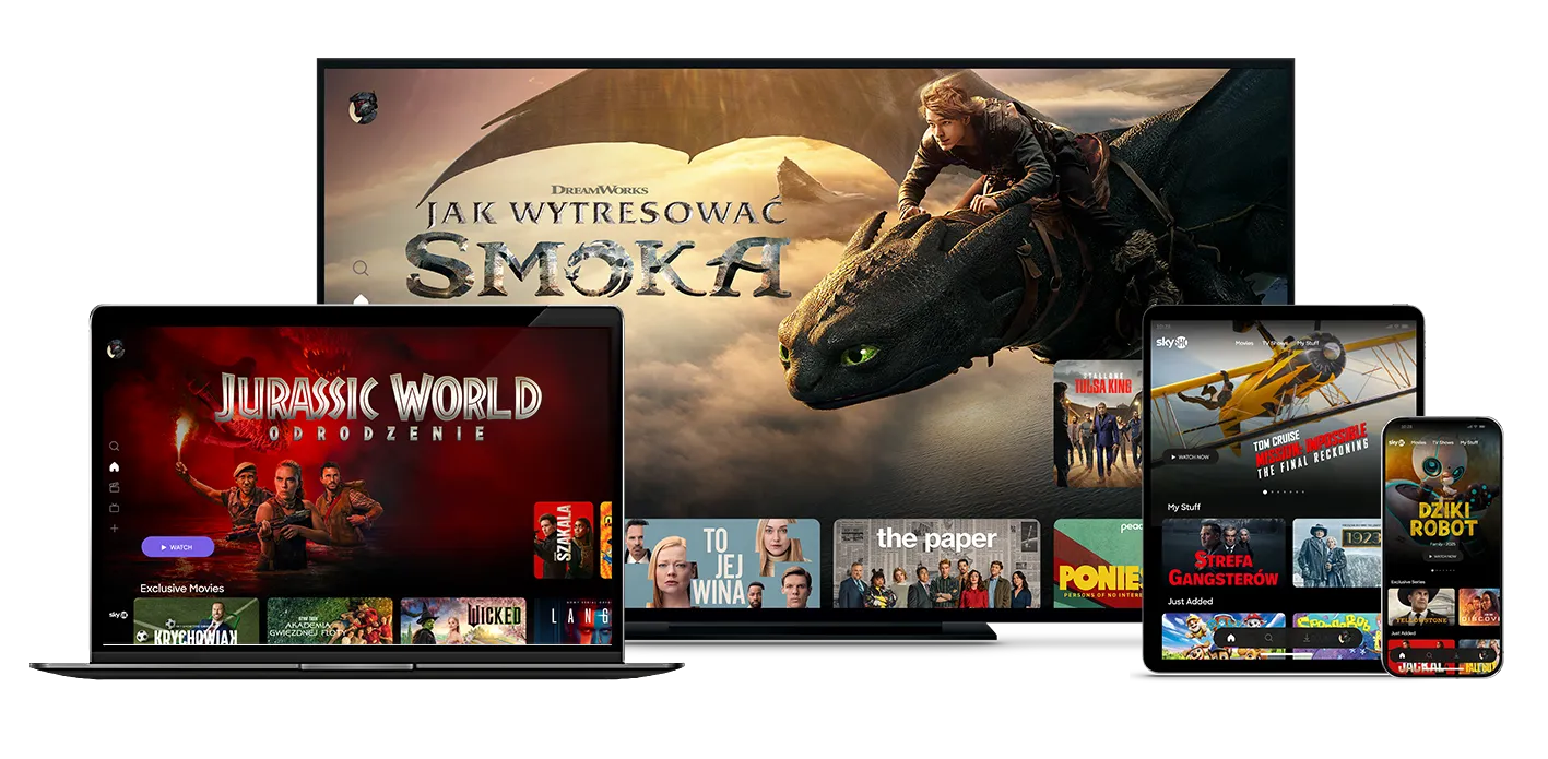 Pobierz aplikację SkyShowtime ze sklepu Google Play, App Store i sklepów wybranych producentów smart TV i innych urządzeń. Aplikacja dostępna również w sklepie Google Play na dekoderze polsat soundbox 4K